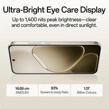 "Ultra-Bright Eye Care Display Up to 1,400nits peak brightness—clear and comfortable, even in direct sunlight. 16.69cm AMOLED 93% screen-to-body ratio 1.07 billion colours"